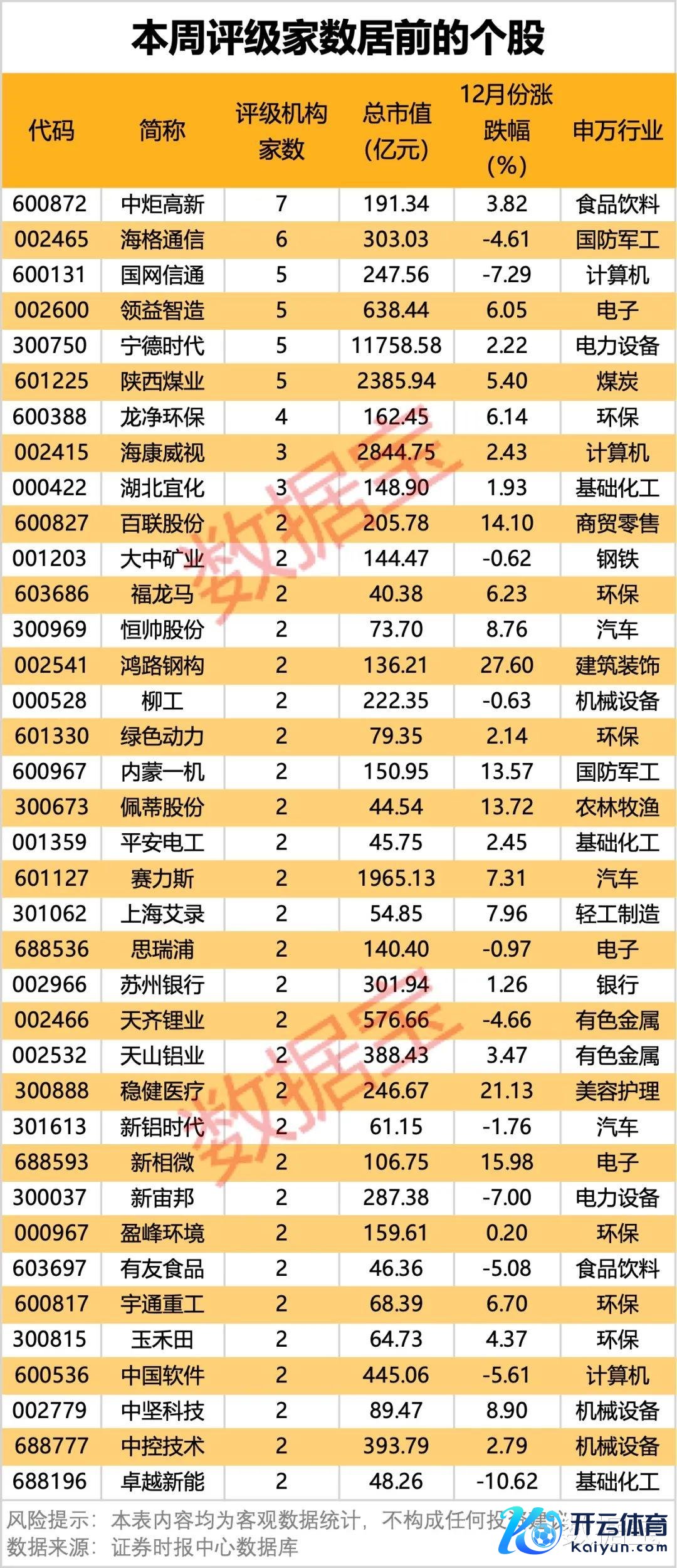 37股获2家及以上机构给以评级,机构关切度最高的是中炬高新,有7家机构评级;紧随后来的是海格通讯,有6家机构评级。另外,国网信通、领益智造、宁德期间、陕西煤业均有5家机构要点关切。