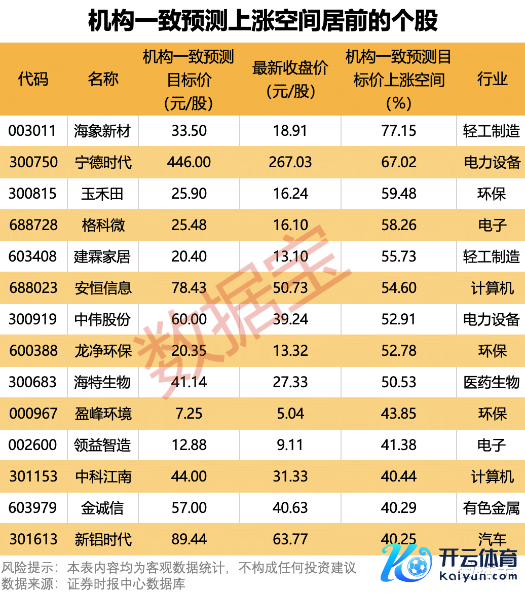 本周机构评级的个股中,14股最新收盘价较机构一致预测办法价上腾飞间超40%,其中海象新材上腾飞间达77.15%,宁德期间、玉禾田、格科微等也均超50%。