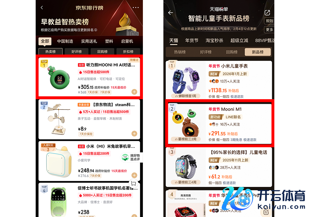 ▲Mooni M1登上京东早教益智热卖榜Top 1、天猫智能儿童腕表新品榜Top2