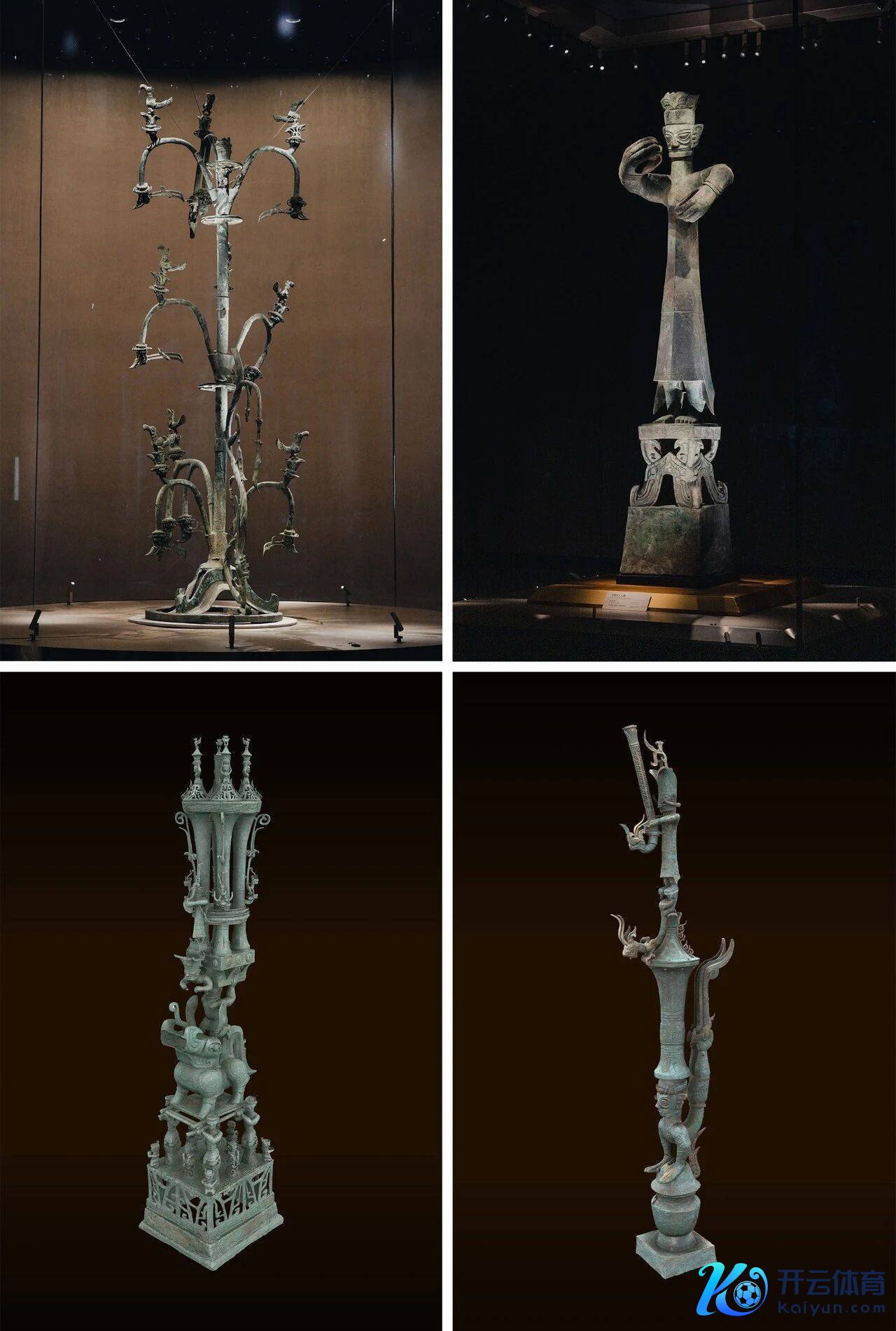 图为三星堆博物馆部分文物:左上为一号青铜神树、右上为青铜立东谈主像、左下为青铜神坛(筹办性回应)、右下为青铜鸟足神像(筹办性回应)。三星堆博物馆供图