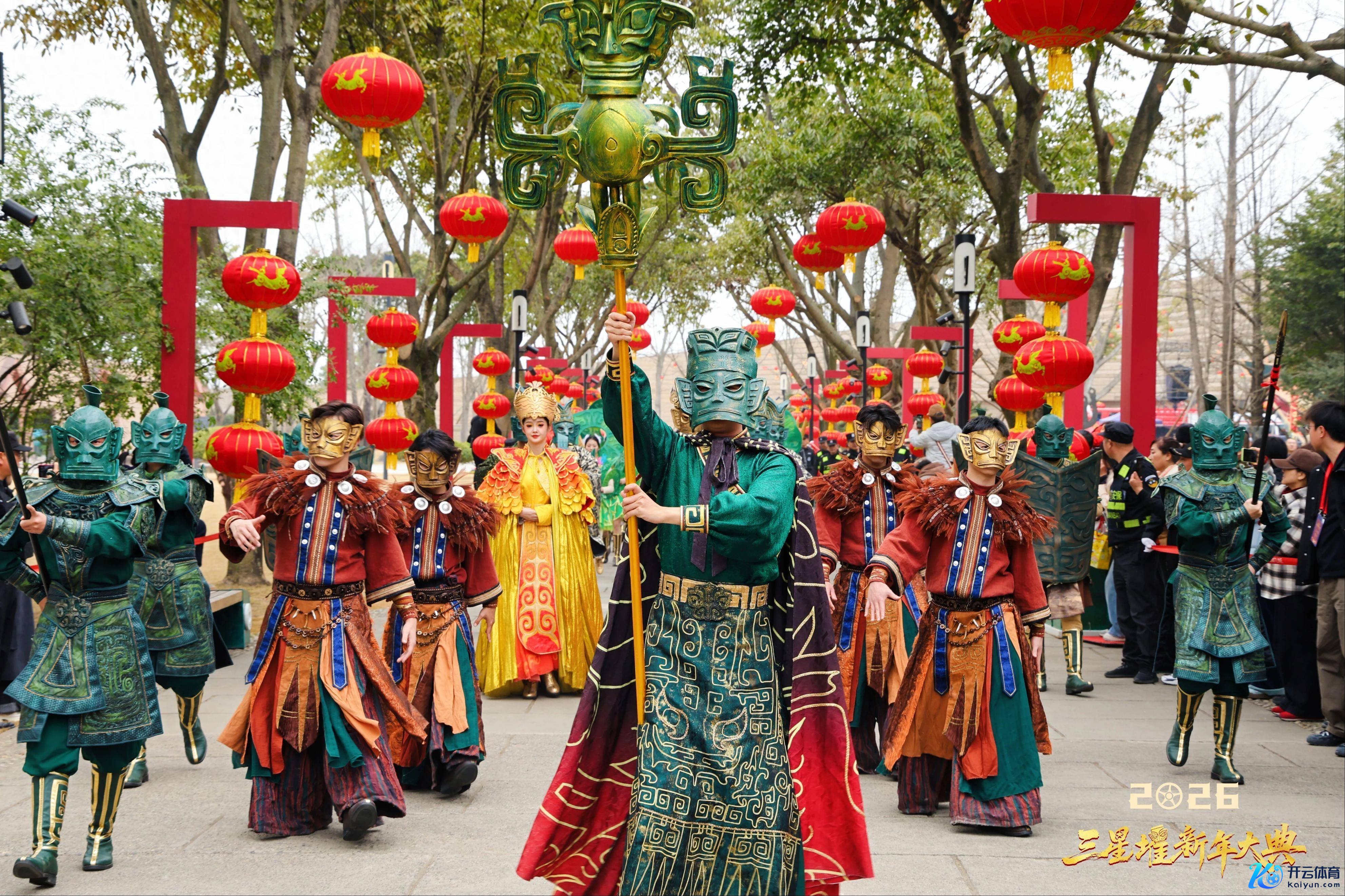 三星堆里过大年,古蜀圣地祈新福。2026年正月月吉至初七,三星堆博物馆推出“新年大典”,将千里浸式演艺、跨界互动与新春祈愿深度合资。图为“古蜀道喜游行”步履现场。三星堆博物馆供图