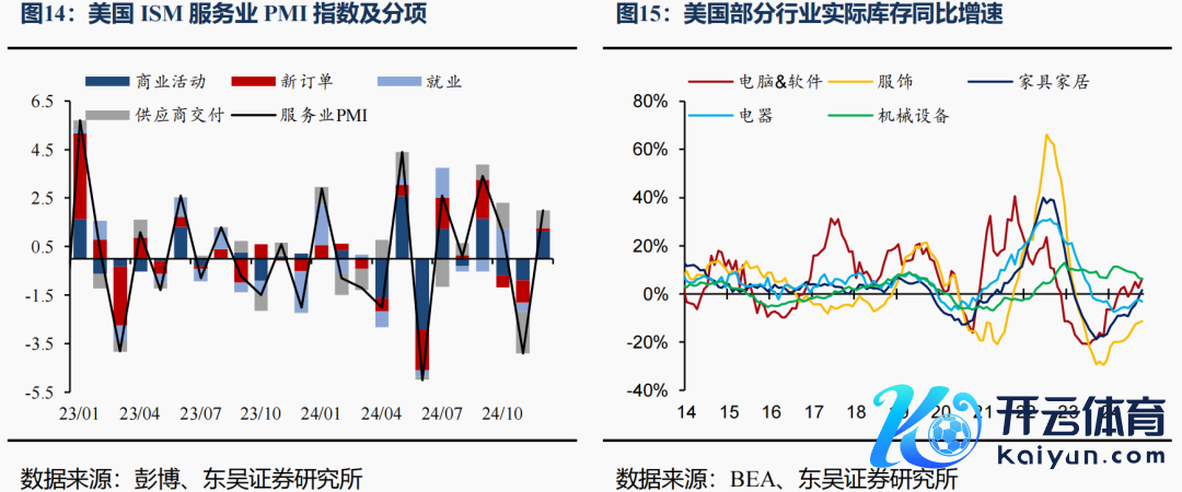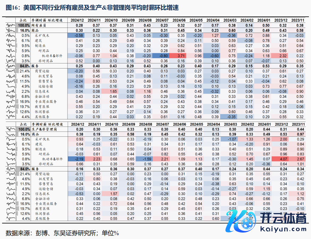 劳务需求:100bps的降息与抢出口效应带动12月劳动走强。①100bps降息的潜力儿。2024年9月以来好意思联储已累计降息100bps,利率界限性水平的缓解对需求的提振在近期12月信济数据中已有所体现,包括利率明锐的房地产销售的回暖、中枢耐用品订单环比超预期增长、服务业PMI劳动指数保管高景气等,相易特朗普战术对企业乐不雅情感的提振,共同带动劳动需求景气的复苏。②抢出口带动部分行业劳动增长。12月新增25.6万的非农劳动中,零卖营业新增4.3万,其中与对华出口密切联系的衣饰、娱乐用品行业劳动分袂新增2.3、1万东说念主。这些行业特征也与近期好意思国ISM制造业论述、库存数据中的一些细节交叉考据:12月ISM制造业PMI库存分项表现,好意思国制造业企业出于对顾忌潜在关税的担忧运转加快累库(图14);最新库存数据表现,好意思国衣饰行业库存同比增速从底部加快成立(图15)。
