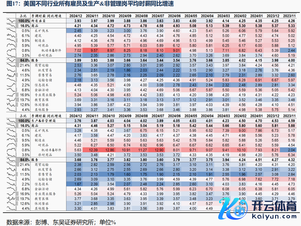 天然,12月劳动数据仍有极少薄弱设施:①制造业劳动权臣走弱,服务业也曾主力。老师医保、闲散餐旅、商贸运输分袂新增劳动8、4.3、4.9万东说念主,也曾12月劳动增长的主力,而制造业劳动环比-1.3万,其中耐用品制造业-1.6万,是主要牵扯,在上月天真车歇工已毕后,制造业劳动延续时弊。②劳动扩散指数环比回落。1年期非农劳动扩散指数本次录得59,较前值62回落;1个月、3个月扩散指数亦出现不同流程下行,标明劳动减少的行业数目仍多于劳动增长的行业;③供需缺口抬升的同期时薪增速回落。12月劳务总需求增多73.7万,总供给增多24.3万,共同带动供需缺口由71.8万再度回升至121.2万。供需平衡下,12月时薪环比+0.28%,预期+0.3%,前值+0.37%;同比+3.93%,预期+4.0%,前值+3.97%;分娩&非措置岗时薪环比+0.2%,前值+0.3%;同比+3.76%,前值+3.87%。供需缺口走阔很猛流程受职位空白走高影响,其抓续性有待不雅察;时薪增速走弱在结构上主要受天真车、IT行业牵扯,且市集(尤其是好意思股)并未交游时薪增速的走弱。
