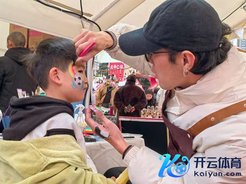 摊主粟炜炜忙得不亦乐乎,他是别称后生创业者,主营赛事阁下脸绘。开赛前2个多小时,他就给50余东说念主进行了脸绘。