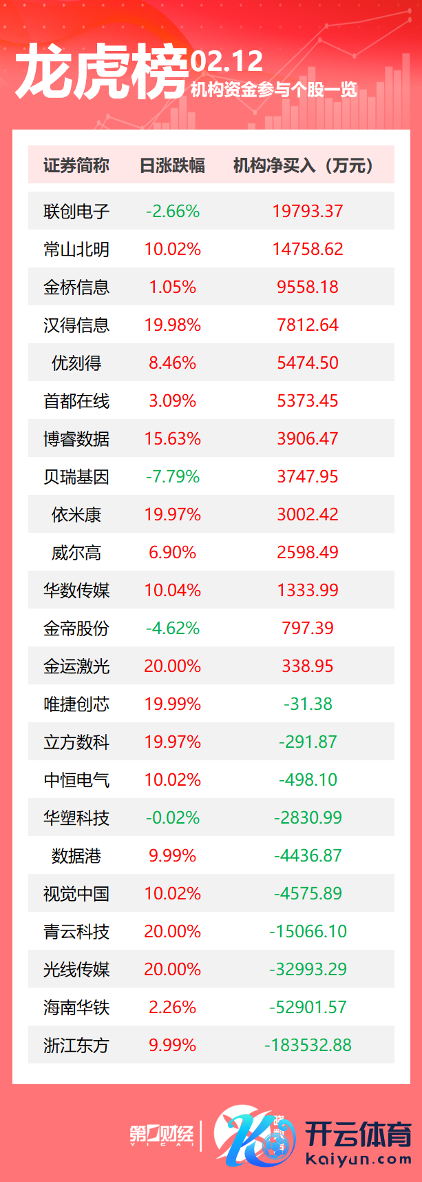 2月12日龙虎榜中,共23只个股出现了机构的身影,13只股票呈现机构净买入,10只股票呈现机构净卖出。当天机构净买入前三的股票区别是联创电子、常山北明、金桥信息。当天机构净卖出前三的股票区别是浙江东方、海南华铁、光辉传媒。
