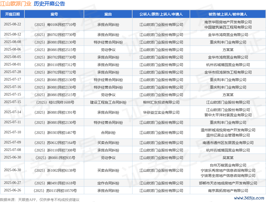 案号:(2025)浙0702民初7730号审理法院:金华市婺城区东说念主民法院案由:承揽条约纠纷当事东说念主信息: 原告/上诉东说念主:山河欧派门业股份有限公司 被告/被上诉东说念主:金华市鸿商置业有限公司开庭日历:2025年8月12日凭据统计,近一年内以山河欧派门业股份有限公司为当事东说念主的历史开庭公告有104则,其中案由为“承揽条约纠纷”的公告以30则居首,其次为“生意条约纠纷”有25则,“树立工程施工条约纠纷”有12则。历史开庭公告(前20条)如下: