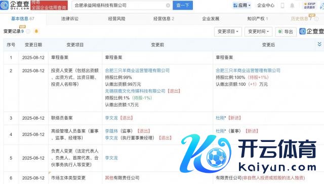 8 月 12 日,合肥承益鸠集科技有限公司发生工商变更,小杨哥门徒李文龙(网红"嘴哥")卸任该公法则定代表东谈主、本质董事、司理,杜刚接任法定代表东谈主,并担任董事,原鼓吹无锡丽鹿文化传媒科技有限公司退出,同期部分主要东谈主员发生变更。鼓吹信息泄露,该公司现由合肥三只羊交易运营搞定有限公司全资握股。